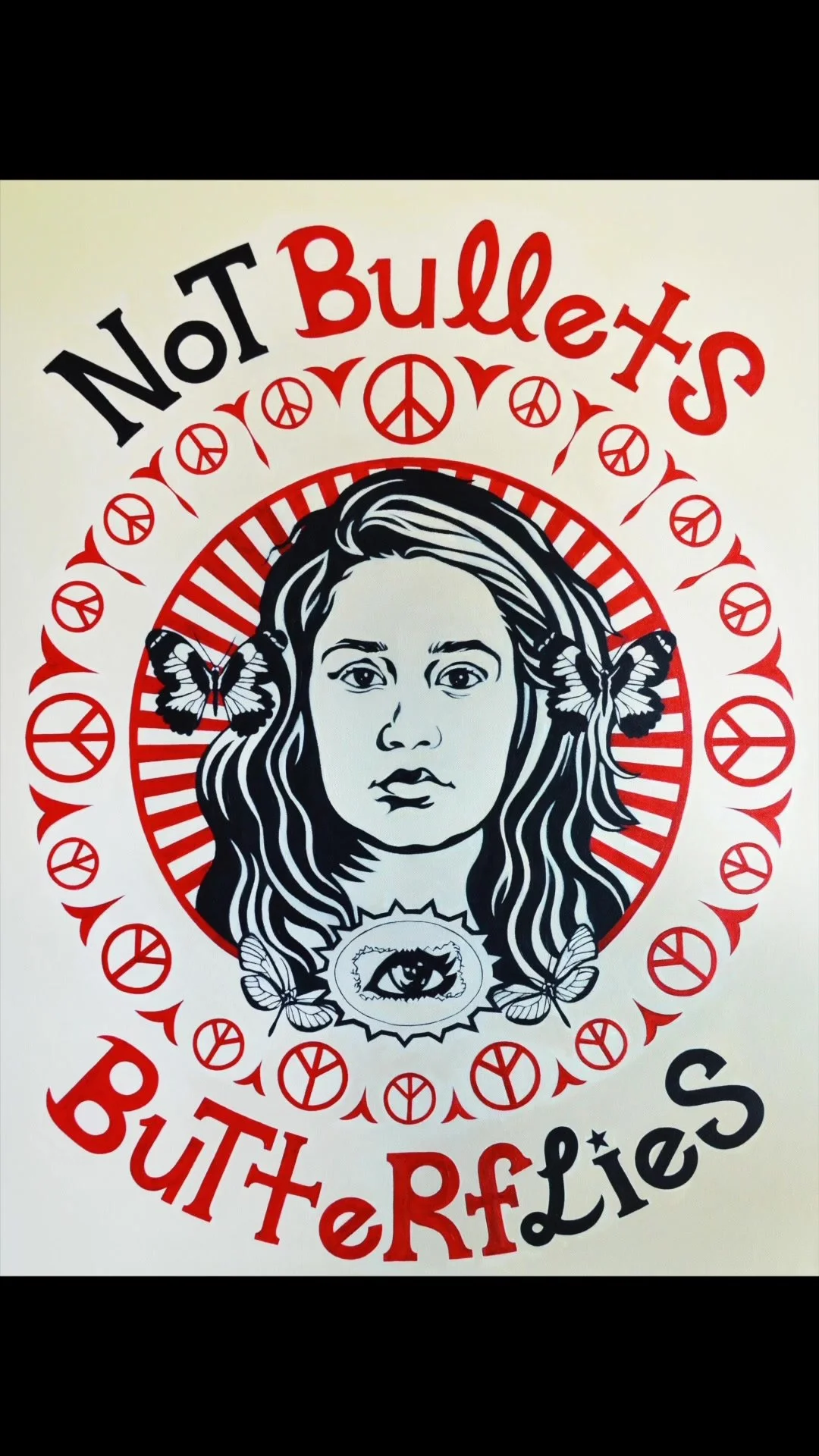 Music: The Fifth Dimension “Let the Sunshine In” For me butterflies represent rebirth, resurrection, transfiguration, or even reincarnation. We are all changing. I am not the same person I was a few years ago; not even a few months ago. Everything we observe and experience changes us in little or profound ways. We go through tiny revolutions of thought and feeling until we have evolved into sometimes entirely different sorts. Our basic essence, our core beliefs of wickedness and good may remain unaltered; but how we perceive ourselves and how we present ourselves to others constantly changes. The truer your observations and the more unabashed your experiences gauges the levels of yourself you shall discover and what kind of person you might truly be. And often you won't particularly like what you have found. In this painting butterflies represent nature and the possibility of creation and rebirth of spirit. Bullets represent destruction and stand as the opposite of natural creation. The words Not and Lies are a double-entendre that represents how we should be honest with ourselves that destruction, that violence, that war is not the answer and that rebirth and the embracement of nature and creation are. We teach our children that violence begets violence. When you strike another they will strike you back, or later strike someone else. We tell our children that violence does not solve anything and that it is never the answer. The United States of America has troops stationed in over 135 different nations, some for over fifty years. We spend roughly the equivalent of the entire remainder of the world on a military which can only truly be compared to the armies of Rome in its degree and scope. Edward Gibbon wrote, in his History of the Decline and Fall of the Roman Empire, that Rome "endeavored to convince mankind that the Roman power, raised above the temptation of conquest, was actuated only by the love of order and justice." Now the U.S. does engage in massive and wondrous deeds of relief, charity, and donation. But we also give money and arms to countries in conflict and crisis and all of our charity is accompanied by military boots on the ground. Preemptive Strike, Tactical Military Attack, and Collateral Damage are all that many countries in the world know from or of us. Imagine if we closed all of our bases and brought home all of our soldiers? Imagine if we never gave guns and military aid to anyone else? Imagine if our entire foreign policy consisted of giving nothing but food, medicine and agricultural and industrial aid to the world? Imagine if every child in the world's vision of us was not a soldier with a gun in his hand, but a package of food, a blanket, or a vaccine or aspirin; with a little American flag printed upon it. Maybe even a little American flag with a smily face printed in the middle? Why would a child like that ever want to grow up to attack us? We could change ourselves and the world if we wanted to. Violence begets violence. That is not a lie. Not Bullets, Butterflies.